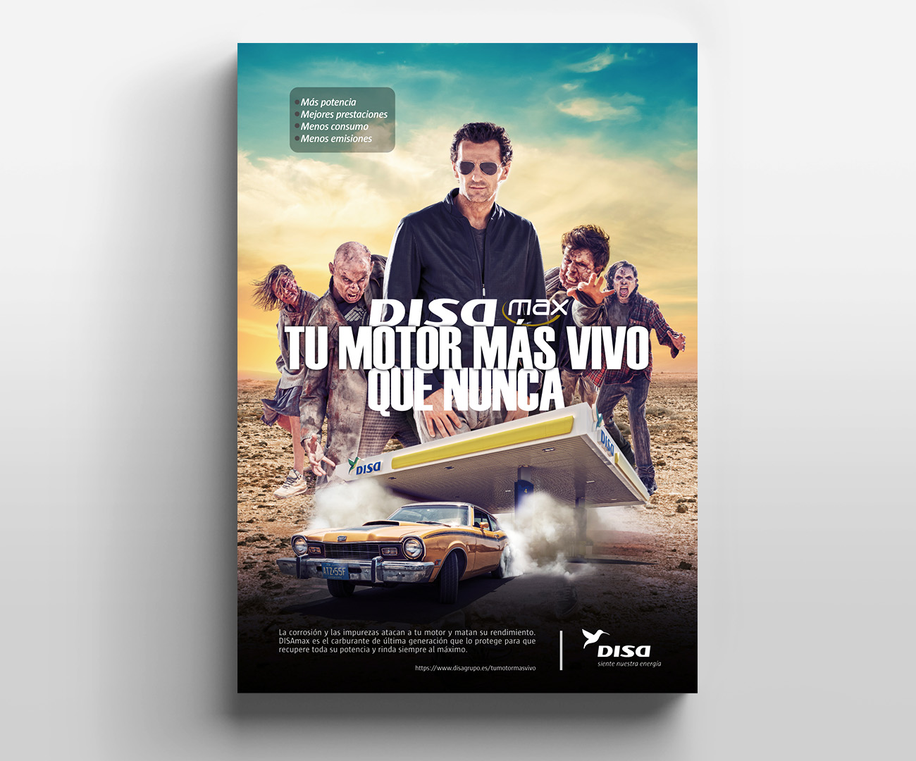 DISAmax es un carburante de última generación que protege el motor de la corrosión y las impurezas que, con el tiempo, van acumulándose y provocan pérdidas de rendimiento y averías en el vehículo. Para contar estos beneficios de una forma espectacular y memorable, hemos hecho esta campaña tan cinematográfica. Convertimos a los enemigos del vehículo –la corrosión y las impurezas– en rabiosos zombis que persiguen y atacan el vehículo. Al volante, el expiloto de Fórmula-1 Pedro de la Rosa, embajador de la marca para su gama de combustibles, convertido en héroe de acción. Un poco de rock`n´roll y el espectáculo está servido.