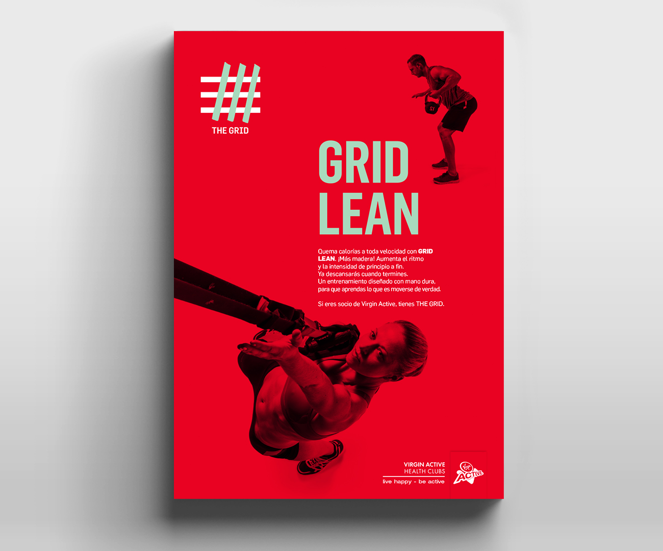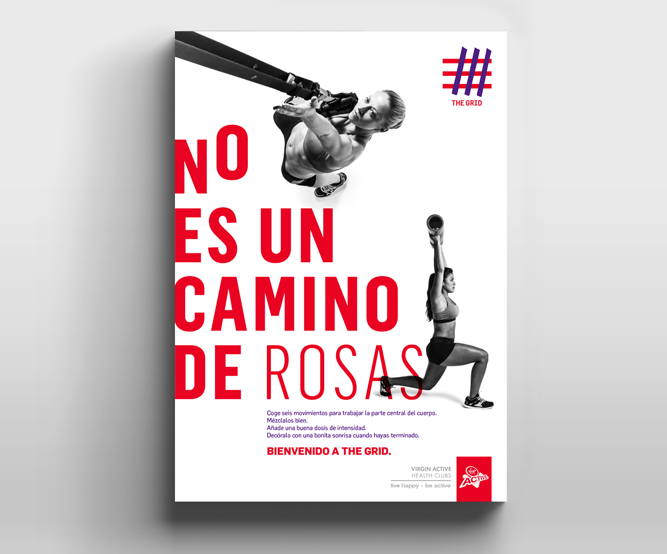 Realizamos esta campaña para dar a conocer The Grid, el programa de entrenamiento de Virgin Active más duro y exigente. Con un área específica exclusivamente en el centro de Madrid Las Rozas, el programa consistía en una rutina de seis ejercicios súper intensos para trabajar el core y quemar calorías como si no hubiera un mañana. Cada sesión duraba solo treinta minutos, porque nadie aguantaba más.
